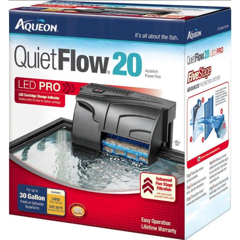 The Aqueon QuietFlow LED Pro Power Filter is built for easy operation with enhanced five-stage filtration to keep your water cleaner than ever. Cartridge replacement is quick, without requiring you to touch the dirty cartridge. The auto-start pump requires no priming and automatically restarts if power is interrupted.