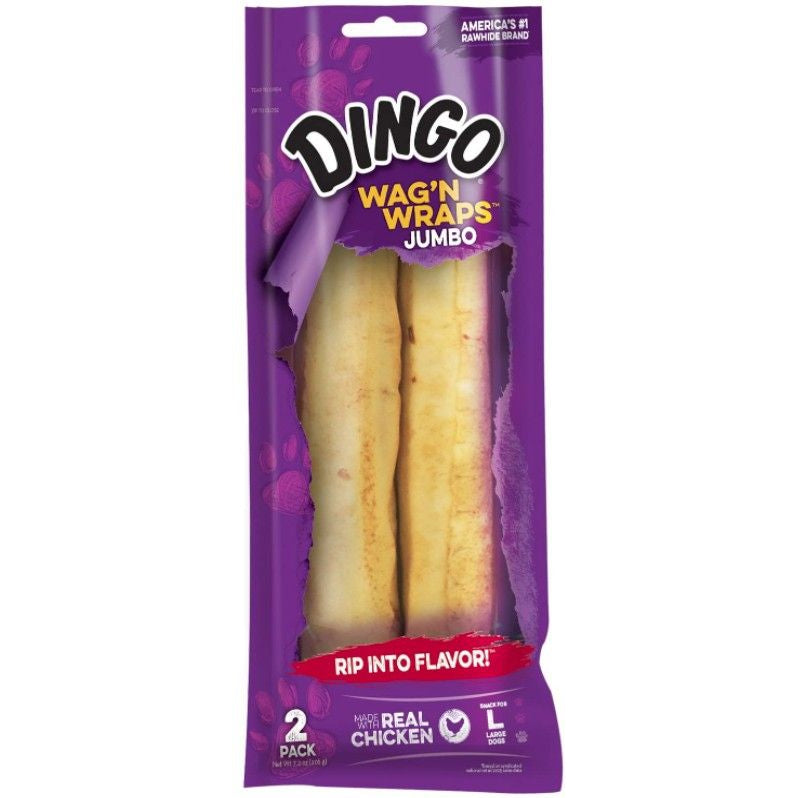 Dingo brand combines powerful flavors and benefits to create bones, chews and treats that are sure to keep you and your dog wanting more. With a wide variety of shapes and flavors, there are options for any size companion. Reward your dog with a delicious treat that satisfies you both! Dingo Wag'n Wraps rawhide chews are delicious treats your big dog can't resist! Dingo Jumbo Wag'n Wraps are premium rawhide wrapped around a chewy center with real chicken inside and sized right for your large dog! Other chews may have "meaty " centers, but only Dingo Jumbo Wag'n Wraps have a real chicken you can see and your big dog will love!