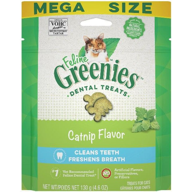 Feline Greenies Catnip Flavor Dental Cat Treats were designed to help keep your cats teeth clean and healthy. The crunchy texture of these irresistible cat snacks helps clean teeth, reduce tartar buildup, and freshen your cats breath, letting you enjoy cuddle time even more. Made with natural ingredients plus vitamins, minerals, and other nutrients, these tasty treats are also nutritionally complete and balanced for adult cats. Plus, Feline Greenies Dental Treats contain less than 2 calories per treat.
