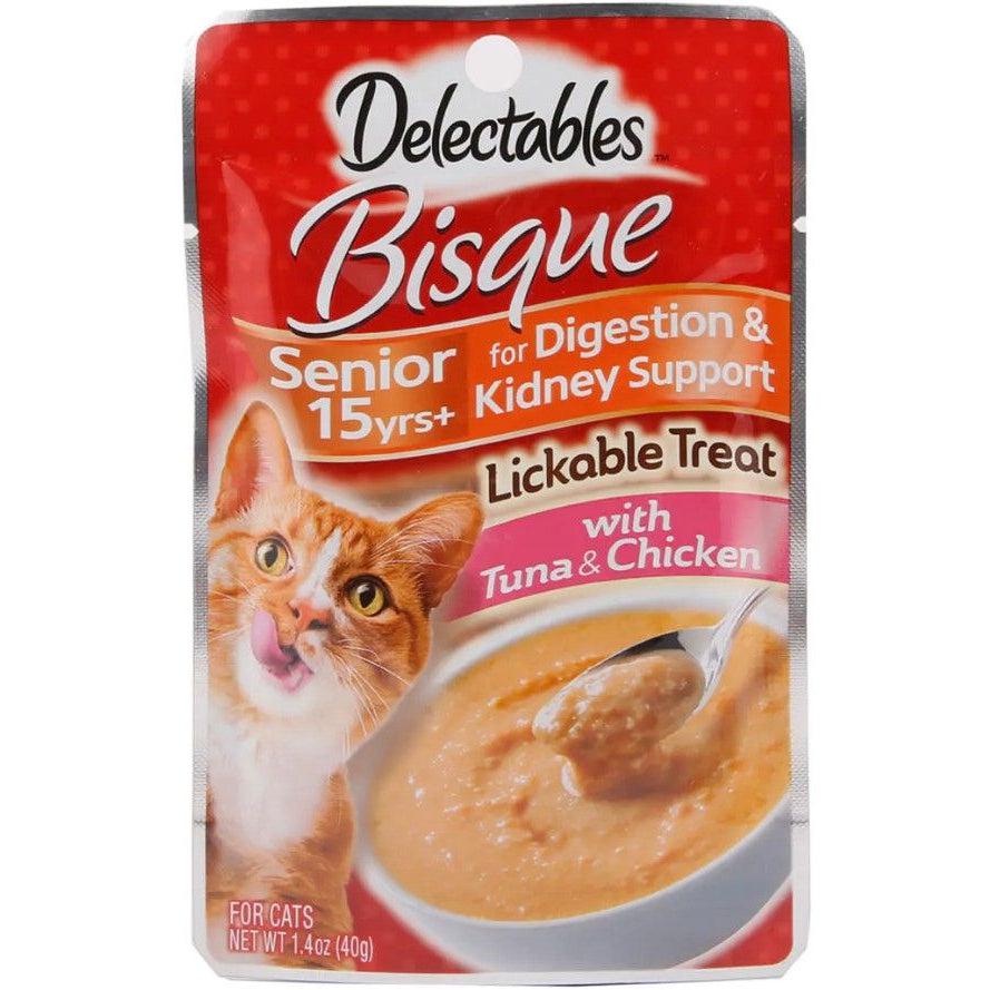 Hartz Delectables Bisque Lickable Treat for Senior Cats features a creamy blend of real tuna and chicken in a rich, flavorful sauce that no cat can resist. With added potassium and prebiotics, it supports enhanced kidney and digestive system function for aging cats 15 years and older.