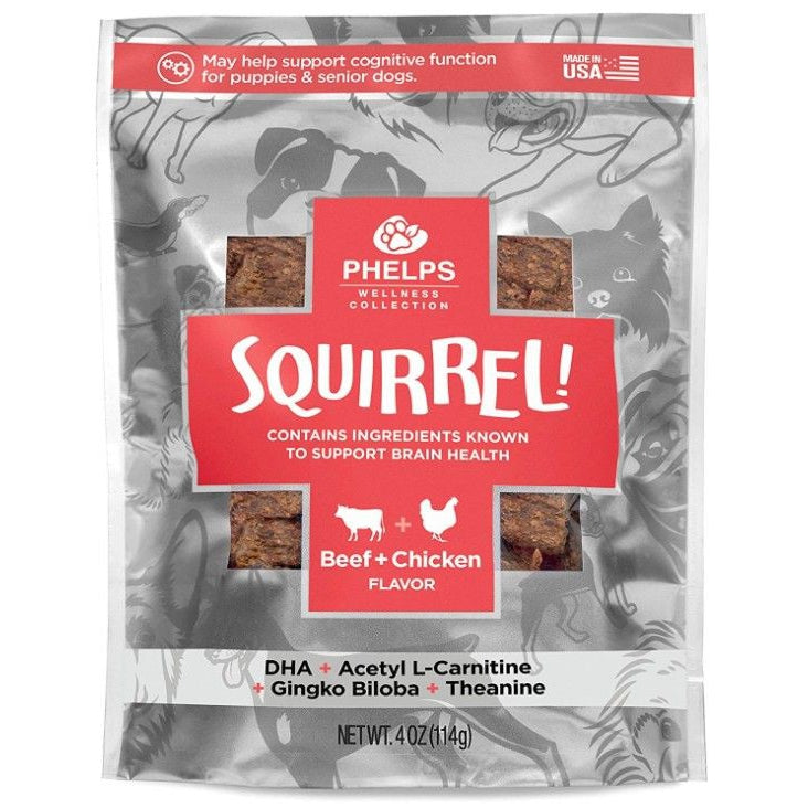 At Phelps Pet Products, weve been making great tasting 'pharm-to-table' dog treats designed to support pet health and vitality since 1966. Squirrel Attention Focusing Beef & Chicken Flavor Dog Treats are attention-focusing treats for puppies and senior dogs. With flaxseed, gingko biloba, and tuna oil. No wheat, corn, or soy. Contains ingredients known to support brain health.
