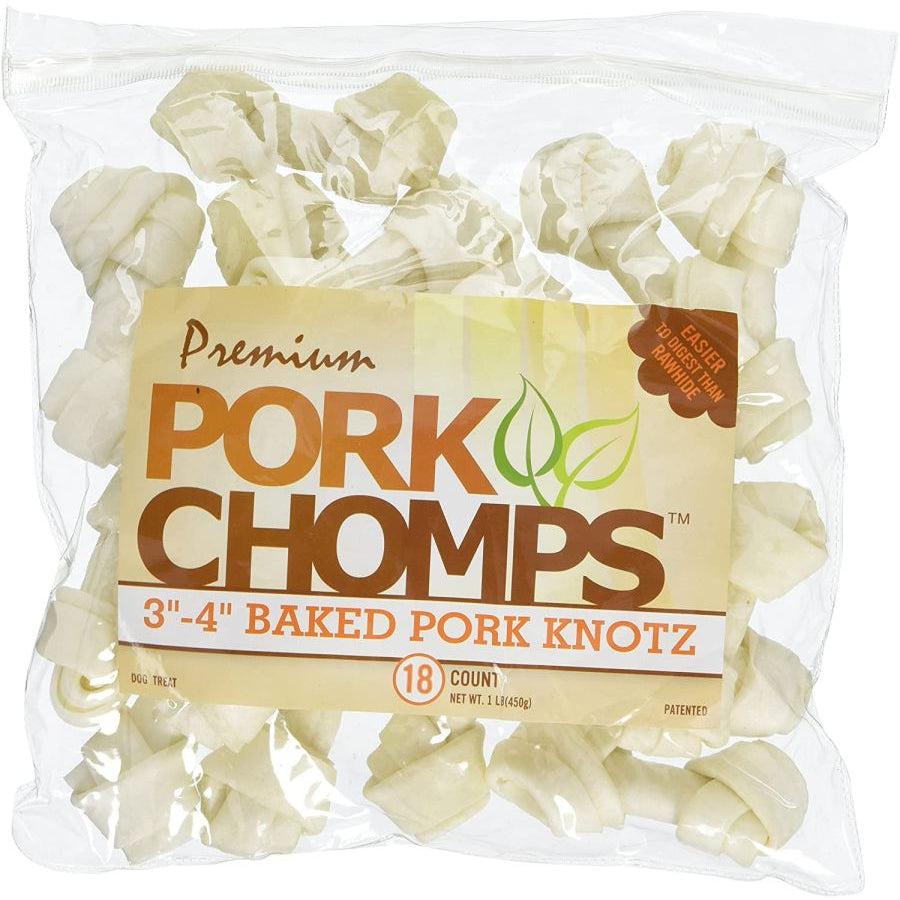 Pork Chomps Large Baked Pork Knotz Pork Skin Dog Treats feature all the great features your dog loves about Pork Chomps Twists, tied up into a traditional bone shape! These chews are delicious, long-lasting, and much easier to digest than traditional rawhide.