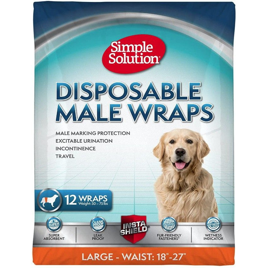 Simple Solution Large Disposable Male Wraps provide a convenient, secure solution for male marking, excitable urination, incontinence, and nervousness during travel. These super absorbent, leak-proof wraps feature fur-friendly fasteners to keep your dog comfortable, and a wetness indicator so you know when its time for a change.