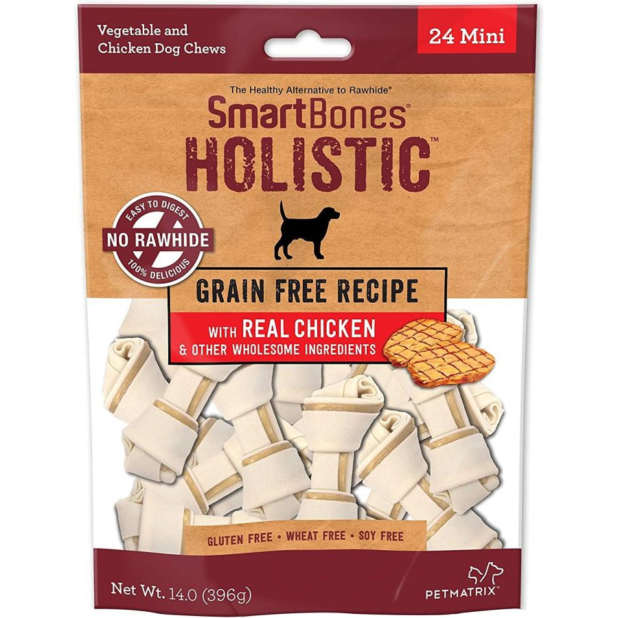 SmartBones Holistic Grain Free Dog Chews are made with real chicken and other wholesome ingredients, including vegetables. These yummy, fun to chew bones contain NO rawhide, gluten, wheat, or soy, making them easy to digest and healthier for your dog.
