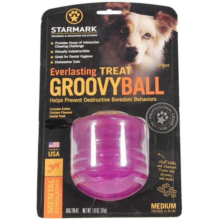 The Everlasting Groovy Ball keeps your dog entertained when treats or kibble are stuffed into the grooves and topped with an Everlasting Treat. Treat ball puzzles encourage play which helps reduce anxiety and problem behaviors caused by boredom. Stronger than rubber and great for powerful chewers. Free of latex, vinyl, and phthalates.