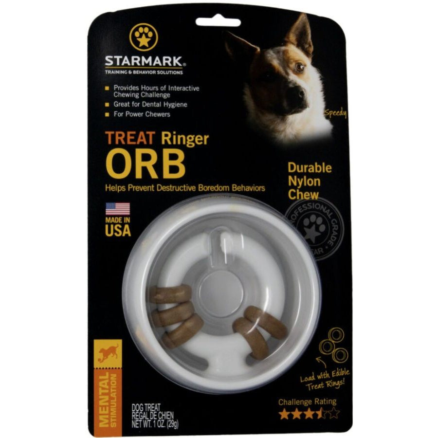 Starmark Mental Stimulation toys help keep pets mentally engaged in an activity they enjoy. They help foster natural hunting and foraging behaviors and help prevent destructive boredom behaviors. Starmarks Orb Ringer Toy provides an extremely durable new chewing challenge!